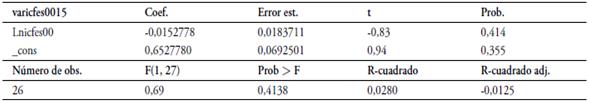 En la anterior tabla el estadístico F sigue siendo no significativo, el R2 es bajo y el coeficiente beta sigue siendo negativo, pero sin ser significativo, lo cual no evidencia resultado de convergencia regional. El modelo queda especificado de la siguiente forma: