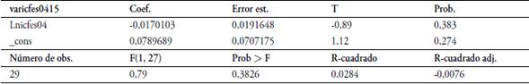En el indicador de los resultados de las pruebas Icfes del periodo 2000-2015 se observa que el estadístico F no es significativo, el R2 es muy bajo y el beta, aunque tiene signo negativo, no es significativo, lo cual no se puede concluir como un proceso de convergencia. Sin embargo, para el año 2000 no se cuentan con datos de Mapiripán, La Uribe y Puerto Concordia, los cuales tienen datos a partir del 2004. Por lo anterior, para examinar si existe un proceso de convergencia regional se procede en la tabla 4 a realizar la regresión entre el 2004 y el 2015. Este modelo queda especificado de la siguiente forma: