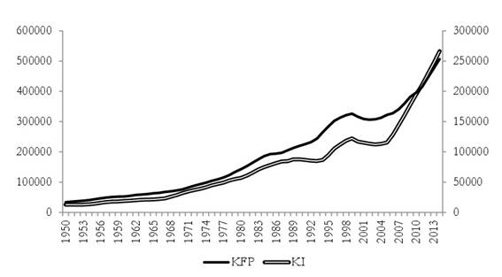 El Gráfico 1 muestra las sendas temporales del capital fijo privado (KFP: línea continua medida a la izquierda) y del capital infraestructural (KI: línea doble medida a la derecha) entre 1950 y 2014. Se observa que entre 1950 y 1978 ambos acervos evolucionaron pari passu, pero luego se abrió una brecha que apenas se volvió a cerrar hacia 2010.