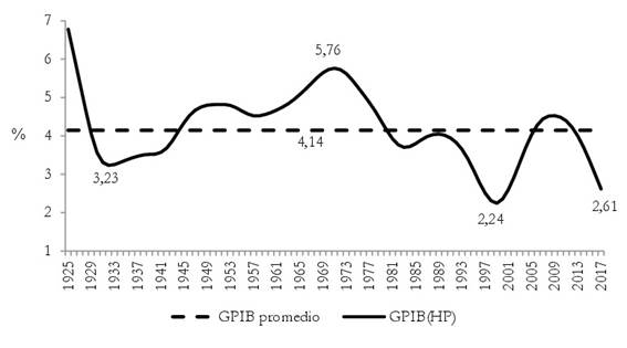 Todos estos esfuerzos analíticos se dirigen en últimas a entender la dinámica económica nacional, y por ello es necesario conocer cómo se ha comportado. Con las series del PIB de la CEPAL (1957), del Banco de la República (1958), y del DANE (1950 hasta la actualidad) se construye la serie de 1925 a 2017 a precios de 2005, y también, por supuesto, se deriva la serie de la tasa de crecimiento nacional: GPIB (ver el anexo estadístico). Esta última serie es volátil y está sujeta a ciclos, así que en el Gráfico 2 solo se presentan la tendencia de la tasa de crecimiento estimada con el filtro de Hodrick y Prescott y la tasa de crecimiento promedio anual del PIB del período 1925-2017.