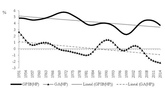 La información estimada permite calcular que la tasa de crecimiento promedio de la productividad multifactorial en el período 1951-2014 fue casi nula (0,1%), mientras que la tasa de crecimiento promedio anual fue del 4,31%. Estos resultados sugieren que el crecimiento económico nacional ha sido primordialmente extensivo: se explica casi totalmente por la expansión de los factores productivos (capital privado fijo, capital humano e infraestructura). La tendencia de la variable GA se estima por medio del filtro de Hodrick y Prescott [GA(HP)] y se presenta en el Gráfico 3 junto con la tendencia del crecimiento económico nacional [GPIB(HP)].