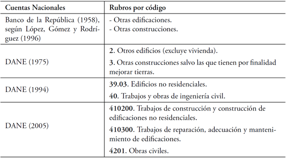 El aporte metodológico de este trabajo radica principalmente en la desagregación de la formación bruta de capital fijo (FBKF) que reportan las diferentes cuentas nacionales de Colombia en el período 1950-2014. La formación bruta de capital fijo privado (FBKFP) comprende la inversión en los siguientes rubros: vivienda, mejora de tierras y desarrollo de plantaciones y huertas, equipo de transporte, y maquinaria y equipo. Nótese que, a diferencia de la infraestructura, estos bienes son generalmente demandados y utilizados por las empresas y los hogares -los agentes privados- como bienes de uso exclusivo. Por otra parte, la inversión que contribuye a la acumulación del acervo infraestructural se denomina formación bruta de capital fijo infraestructural (FBKFI). Sean estatales o privados, estos bienes cumplen la función de prestar servicios públicos. La Tabla 1 muestra los componentes de la FBKF que se clasifican como inversión infraestructural según la fuente de las cuentas nacionales y el año base.