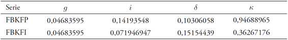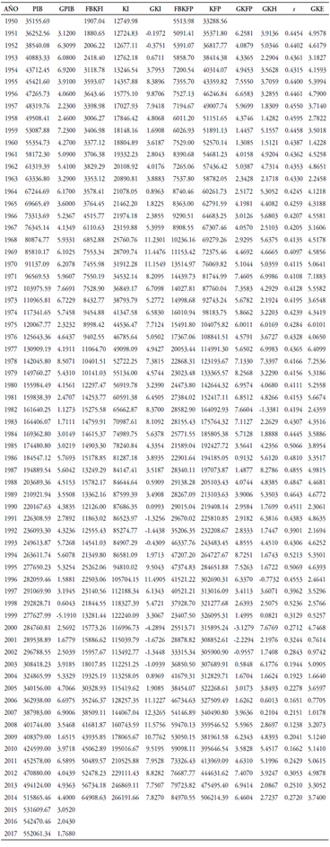 Ya que durante el período 1950-1985 se tuvo una mayor estabilidad del crecimiento económico (la volatilidad aumenta posteriormente), se calcularon los parámetros g e i con las series del PIB, la FBKFI y la FBKFP del período mencionado. El parámetro g es común a los dos cálculos y se estima como la tasa de crecimiento promedio anual del PIB en el período 1950-1985. El coeficiente inversión-producto, i, se estima para cada año del periodo analizado para las dos series de inversión-producto (FBKFI/PIB y FBKFE/PIB); en la Tabla 2 se reporta el promedio anual del período considerado para las dos series; las desviaciones estándar de estas dos series son pequeñas: 0,017 y 0,012, respectivamente. Por otra parte, la tasa de depreciación, δ, se calcula para cada año del período 1965-1995 con las cuentas nacionales con base en 1975.