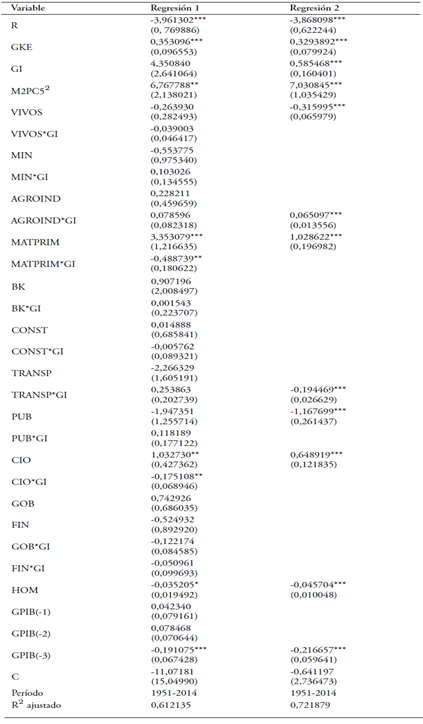 La primera regresión se corre con todas las variables disponibles. Posteriormente, se eliminan de forma secuencial los regresores que no son significativos al 1%; de esta manera se llega a la regresión 2. Como es de esperar, la variable ficticia para las recesiones (R) parece tener un impacto negativo y significativo en el crecimiento económico. Por otro lado, las tasas de acumulación de GKE y GI muestran un impacto positivo y significativo en el crecimiento económico nacional (los coeficientes estimados, respectivamente, son: 0,329 y 0,586).