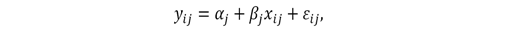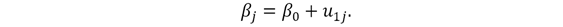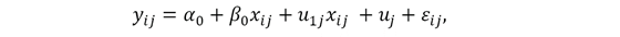 el cual relaciona una variable y (el rendimiento en la prueba de Matemáticas) con una variable x (el nivel socioeconómico) y una perturbación. Además, el intercepto y la pendiente del modelo son específicos a cada unidad; esta es una de las características del modelo que permite que los coeficientes varíen entre unidades de agregación, lo cual se refleja en las siguientes relaciones:
