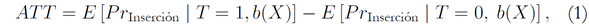 En términos generales, esta metodología se basa en el supuesto de independencia condicional estándar, donde, dependiendo de X, la variable de tratamiento es independiente de los resultados potenciales (Becker & Ichino, 2002). El PSM calcula el efecto medio del tratamiento sobre el grupo de individuos que participan en el programa (ATT), que se define como la diferencia en el resultado promedio de la variable de impacto (probabilidad de inserción laboral) entre aquellos que fueron tratados (T = 1) (los que participaron en los servicios ofrecidos por SPE) y los que no fueron tratados (T = 0) en la forma de: