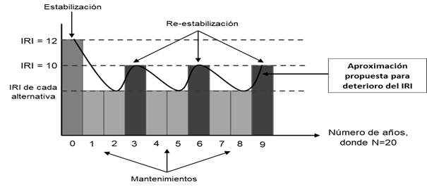 Para los costos de usuario, el estado de la vía (IRI) y la textura del pavimento son las dos únicas variables asociadas directamente con las alternativas de estabilización, pues los demás datos describen características geométricas de la vía o de la zona de análisis, o características de la población. Luego, para este análisis se generaron escenarios de deterioro del estado de la vía en los que el IRI incluyera valores extremos, de 1,2 m/km a 12 m/km, y en los que el valor base medido del IRI cambiara en +/-20%. Esta suposición se validó con expertos.