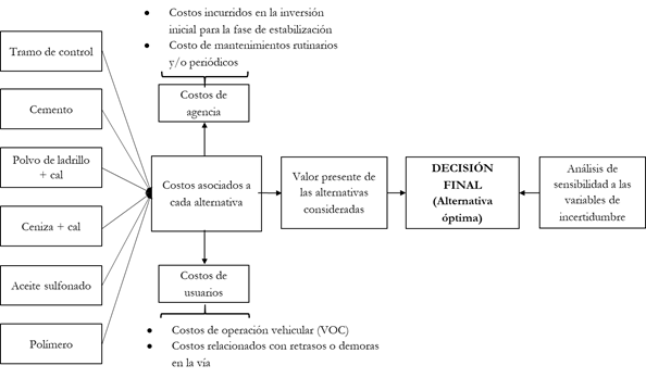 De acuerdo con lo descrito en la Tabla 1, la Figura 2 ilustra la adaptación de la metodología LCCA al análisis y selección de alternativas de estabilización en vías de bajo volumen de tránsito, elaborada a partir del modelo propuesto por Praticò et al. (2011).