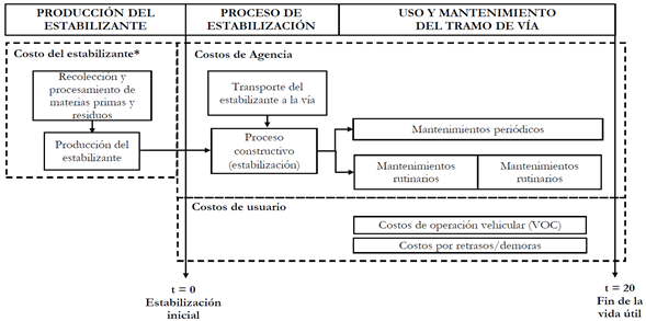 El análisis económico de las alternativas de estabilización tiene tres etapas (Figura 3): primero, la estimación del costo de producción del estabilizante; segundo, la estimación de los costos de las obras de estabilización y, tercero, el costeo de las obras necesarias para mantener la vía con niveles aceptables de transitabilidad y servicio. Los costos de los usuarios hacen parte de las segunda y tercera etapa.
