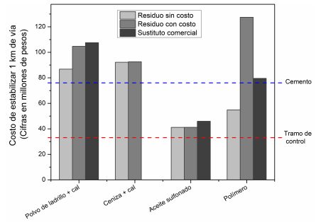 Estos resultados sugieren, por una parte, que, comparada con alternativas comerciales, la estabilización con productos elaborados con aceite sulfonado tiene costos competitivos y, por otra parte, que se necesita un mayor análisis de proveedores para determinar si es posible aprovechar excedentes de polímeros en la elaboración de estabilizantes.
