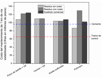 De acuerdo con lo anterior, al comparar el plan de mantenimiento anual del aceite sulfonado con el del cemento, se observa que el costo de la alternativa propuesta es mayor al del referente comercial (cemento), con una diferencia aproximada de entre $7,7 y $11,5 millones de pesos por kilómetro.