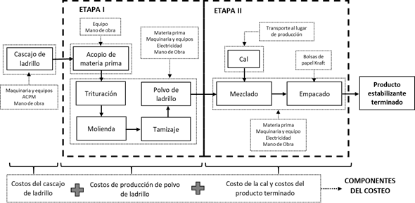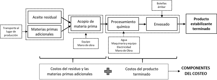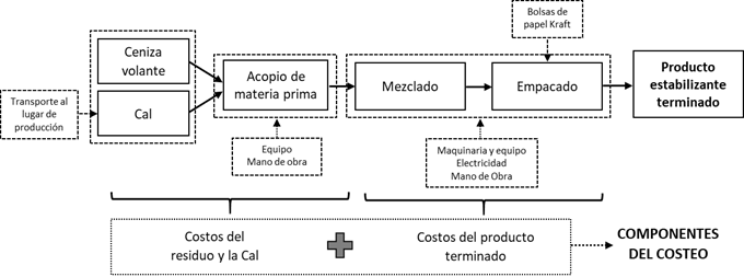 Producción del estabilizante. Se partió de procesos productivos simplificados y se estimaron los componentes principales del costo de capital y operación (transportes de insumos, maquinaria y equipos; mano de obra; materias primas y subproductos; energía, agua, ACPM, etc.) (ver Figuras 1A-4A en los anexos).