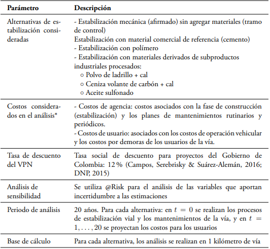 Al estar en estado experimental, la estabilización con los materiales no comerciales mencionados no está normalizada ni se encuentra en las especificaciones del Instituto Nacional de Vías (INVÍAS). Por esta razón, para definir si estos productos son una alternativa viable para el mejoramiento de vías, es necesario estudiar su desempeño técnico, ambiental y económico bajo distintas condiciones. Entre los aspectos económicos a considerar en la evaluación se encuentran los costos de las alternativas.