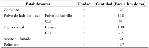 Proceso de construcción. Para cada alternativa se elaboró un presupuesto de obra con las cantidades y rendimientos necesarios para la construcción de un kilómetro de vía. En el análisis de precios unitarios se identificaron actividades generales que se consideran comunes para todos los estabilizantes y actividades que son propias a los procesos de estabilización de cada alternativa, así como los costos y las cantidades de cada producto y de su transporte hasta la vía.