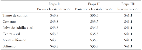 Los costos de agencia del proceso de construcción de la estabilización y los mantenimientos del tramo de vía se estimaron a partir del diseño de presupuestos de obra para 1 kilómetro de carretera tratada con cada una de las alternativas propuestas. En los diseños presupuestales se consideraron variaciones del costo aproximado del producto estabilizante, de acuerdo con lo discutido en la sección IV.