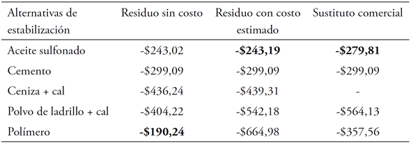En la Tabla 4 puede verse que no hay una alternativa que sea dominante en todos los casos costeados ya que, cuando se asume que el residuo no tiene costo, el estabilizante óptimo es el Polímero, pero para los demás casos es el aceite sulfonado. Luego, la alternativa óptima se definió con los costos de ciclo de vida que asumen subproductos con costo. Esto porque, en un contexto real, con una planta de producción a escala industrial y una demanda constante del residuo, habría un mercado para dicha materia prima y, por tanto, un precio comercial para su adquisición.