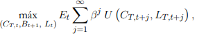 Así, los hogares maximizan una función de utilidad intertemporal para el valor esperado de su utilidad futura sujeto a la restricción presupuestal; para esto, se escoge un nivel de consumo y de trabajo relacionados mediante la siguiente función de utilidad: