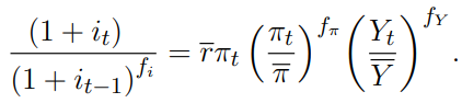 Los parámetros involucrados para el banco central son tomados del Banco de la República, donde r es el logaritmo de la tasa de interés real esperada y, según el Banco de la República, para Colombia es 2 %. Según Gil (2015), el peso de la brecha de la inflación en la reacción de la tasa de política es 1,5 y el peso de la brecha PIB a la reacción de política es 0,5. Finalmente, de acuerdo al comunicado de 2017 del Banco de la República, el PIB potencial para Colombia crece 3,5 %.