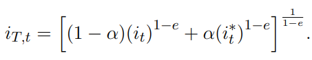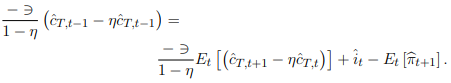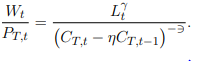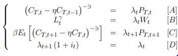 Así, los hogares maximizan una función de utilidad intertemporal para el valor esperado de su utilidad futura sujeto a la restricción presupuestal; para esto, se escoge un nivel de consumo y de trabajo relacionados mediante la siguiente función de utilidad: