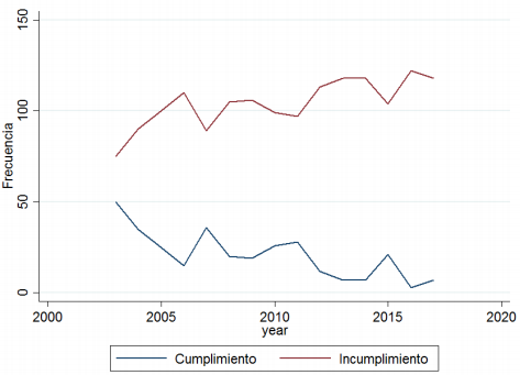 Para el periodo analizado se evidencia una mayor frecuencia del cumplimiento con respecto al incumplimiento. El 83% de los municipios cumplen la ley mientras el 17% la incumplen. Al analizar la frecuencia de cumplimiento de forma dinámica se observa que hay una tendencia a la baja en el incumplimiento con ligeras fluctuaciones al alza en los años 2007, 2011 y 2015; como comparativo en el año 2003 cerca del 40% de los municipios incumplían la ley, para el 2017 el incumplimiento es marginal representando menos del 5%. Si se discrimina el incumplimiento por categoría se encuentra que los municipios de categoría 5 y 6 presentan grandes mejorías con respecto a los municipios de las categorías restantes. La Figura 1 muestra la frecuencia de cumplimiento e incumplimiento de los municipios del Departamento de Antioquia. Las Tablas 1 y 2 muestran las estadísticas descriptivas de las principales variables para ambos tipos de municipio.