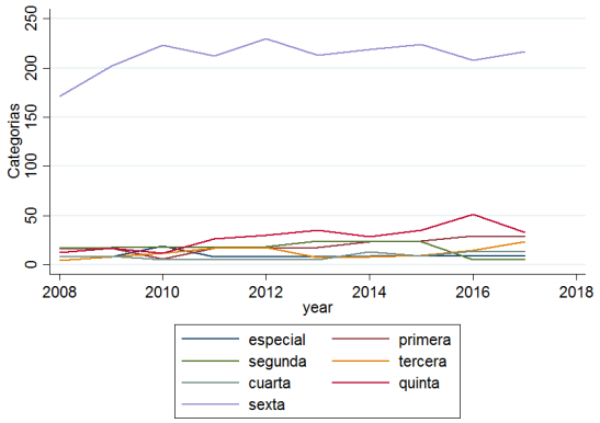 Para los municipios de categoría 6 se evidencia un estancamiento en la densidad empresarial, esto se puede relacionar con la dinámica de cumplimiento dado que el comportamiento en la creación de empresas formales afecta los ingresos tributarios debido a que una de las fuentes de dichos ingresos es impuesto de cámara y comercio; si los municipios de esta categoría cuentan con poca capacidad de generación de ingresos propios y dependen de transferencias, hay mayor probabilidad de incumplir la regla de gasto; es por esto que sorprende el comportamiento de la frecuencia de cumplimiento, puesto que es probable que los planes de recuperación fiscal causen grandes esfuerzos a los municipios para disminuir los recursos destinados a gasto en funcionamiento en relación al gasto de inversión.