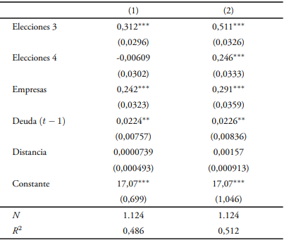 Las variables población y empresas explican a un nivel de significancia menor al 1% la sostenibilidad de las finanzas públicas. Este resultado se debe en parte a que el recaudo de impuestos locales como predial e industria y comercio dependen de estas variables, el efecto de la población en el gasto de inversión es mayor al gasto en funcionamiento, esto se puede interpretar desde la hipótesis de Tiebout (1961), dado que la población manifiesta sus preferencias desplazándose a los municipios que provean bienes públicos más eficientes y que se acerquen a las preferencias de los ciudadanos. Para el ciclo político el encontrarse en el segundo año de gobierno aumenta los ingresos tributarios en 0,76%, este efecto disminuye paulatinamente, lo que sugiere que hay mayor probabilidad de un aumento en la tasa impositiva para personas naturales y jurídicas en los primeros dos años de gobierno. Con respecto al gasto en funcionamiento e inversión tienen un comportamiento bastante similar al ingreso tributario, el mayor efecto se da en el año 2 y baja paulatinamente, en el gasto en funcionamiento la magnitud de los coeficientes para el año 3 y 4 es mucho menor a los estimadores para los mismos años del gasto en inversión.