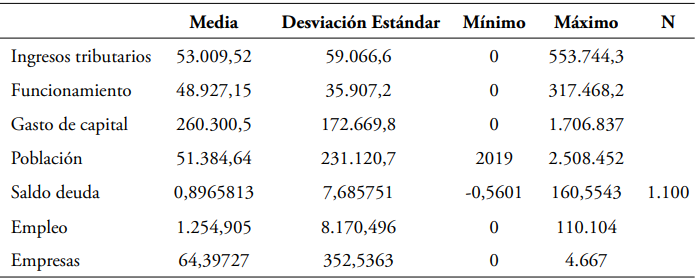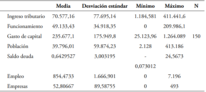 La muestra utilizada en este trabajo está constituida por los 125 municipios del departamento de Antioquia para el periodo 2008-2017. La base de datos utilizada resulta de la concatenación de tres bases de datos diferentes: la del portal territorial del Departamento Nacional de Planeación (DNP), el DATLAS de Bancoldex y proyecciones de población del CENSO del DANE de 2005. Del portal territorial se obtienen información de finanzas públicas, que contiene las operaciones de caja del gobierno e inversión por sectores, registradas en el formato único tributario –FUT– y comprende las transferencias por el sistema general de participaciones –SGP–. De esta base de datos se seleccionaron variables como ingresos tributarios locales, que se compone de impuesto predial, sobretasa a la gasolina, industria y comercio, la variable gasto en funcionamiento hace parte de los gastos corrientes, se compone de gastos en servicios personales, gastos generales y gastos por transferencias generadas por obligaciones de ejecutor y la variable gasto de capital corresponde a las inversiones realizadas por la administración territorial en sectores de su competencia, como salud, educación, saneamiento, infraestructura etc.