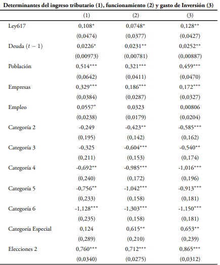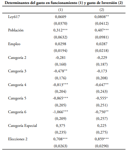 La evidencia sugiere que el cumplimiento de la ley contribuye al incremento de la inversión. La Ley 617 muestra ser significativa para persuadir el exceso de gasto en funcionamiento, este hecho es consistente con las estadísticas que muestran que en promedio los municipios que cumplen el umbral poseen más inversión y menor gasto en funcionamiento. Por otra parte, el esfuerzo de los gobiernos locales por cumplir la ley incrementa los ingresos tributarios, esto se correlaciona con las estadísticas donde se muestra que los municipios que cumplen tienen menores ingresos tributarios per cápita por lo que deben de realizar un mayor esfuerzo fiscal para poder cumplir la ley, lo que podría crear los incentivos para incrementar el esquema tributario local.