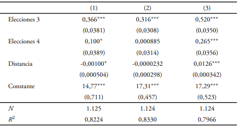 La distancia es estadísticamente significativa para el gasto de inversión, el aumentar 1 km la distancia se aumenta el gasto de inversión en 0,0126%, en la hipótesis se esperaba que el efecto fuera negativo dado que, a mayor cercanía con Medellín, el municipio con mayor complejidad económica (capacidad de generar valor agregado), la inversión debe de ser mayor debido a los “spillover” del conocimiento aún con el signo esperado el efecto es muy pequeño.