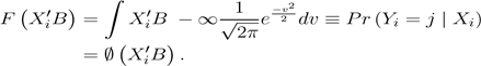 (8)donde B es el vector de coeficientes, Xi′ el vector de características del individuo y ei el término de perturbación aleatoria. El rango de Yi se subdivide en intervalos ordenados, de tal forma que, si el individuo tiene una característica j, Yi = j, donde j tomará valores de entre 0 y J. Así, la presencia de una característica j mostrará la probabilidad de que el individuo pertenezca a categoría j reflejada en