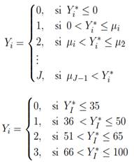 En términos formales, el modelo está constituido por una variable dependiente ordenada Yi que denota el nivel de calificación obtenido por el individuo entre 0 y 100 explicada anteriormente. La respuesta observada puede definirse como una variable latente