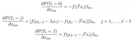 (10)Es así, como la estimación de este modelo se realiza por máxima verosimilitud, el cual nos permite hallar los m − 1 parámetros (Bustamante y Arroyo, 2008). Además, se debe tener en cuenta que en este tipo de modelos los reflejan el sentido de la relación (positiva o negativa), de manera que resultab coeficientes estimados β no indican el cambio en la probabilidad, ya que solo más conveniente analizar los resultados del modelo calculando los efectos marginales, los cuales están definidos para la distribución probit ordenado mediante la siguiente expresión: