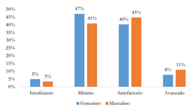 El rendimiento académico de los hombres es levemente superior al de las mujeres en las distintas categorías de puntajes analizadas. La mayoría de los estudiantes se ubican en los niveles de mínimo y satisfactorio; únicamente el 11 % de los hombres y el 8 % de las mujeres obtuvieron puntajes avanzados. Esto significa que aún persisten diferencias de género en la educación en Colombia, y en particular en Nariño, dado que las mujeres aún están en condiciones desiguales con respecto a los hombres, reafirmando los resultados obtenidos por Schüssler (2007) sobre género y educación (ver Figura 1).