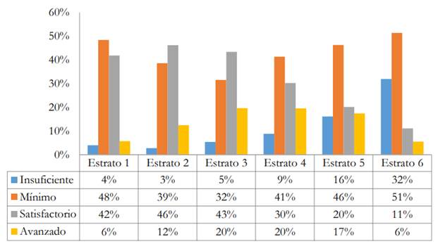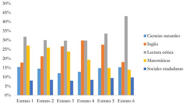 El 55 % de los estudiantes de las instituciones educativas urbanas se encuentran en las dos mejores posiciones de la prueba Saber 11, mientras que el 61 % de la zona rural se ubicaron en las categorías inferiores. Esto reafirma la tesis de Hernández (2017) quien atribuye esta brecha educativa a la infraestructura e ideología de los centros educativos rurales. Los estudiantes de los estratos 1 a 5 obtuvieron mayores puntajes en Lectura crítica, Matemática e Inglés, y por su parte, los alumnos de estrato 6 sobresalen en Ciencias naturales, Lectura crítica e Inglés, como se muestra en las Figuras 5 y 6.