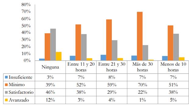 A medida que los estudiantes laboran más horas a la semana disminuye su rendimiento académico, así pues, los estudiantes que no trabajan (se dedican exclusivamente a estudiar) o aquellos que trabajan parcialmente (carga laboral menor a 10 horas semanales) obtuvieron los mejores resultados, como se muestra en la Figura 3. La ocupación laboral de los estudiantes influye en el tiempo que dedican a sus estudios, lo cual reafirma lo planteado por Díaz (s.f.) sobre el desgaste físico, mental y la falta de práctica que genera trabajar en los estudiantes, afectando negativamente su rendimiento académico.