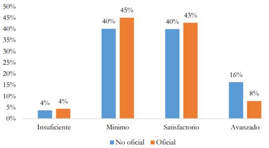 La diferencia de puntajes de la Prueba Saber 11 entre instituciones educativas oficiales y no oficiales en el departamento de Nariño es relativamente mínima, al menos en las categorías de insuficiente, mínimo y satisfactorio. En todas ellas, las instituciones educativas oficiales obtuvieron un mejor rendimiento académico, sobresaliendo en la categoría de puntaje avanzado con 16 %, mientras que las no oficiales solo obtuvieron la mitad de dicho puntaje. Vale la pena resaltar este aspecto dada las difíciles condiciones de prestación del servicio educativo en las instituciones oficiales donde el presupuesto de inversión es cada vez más restringido (ver Figura 4).