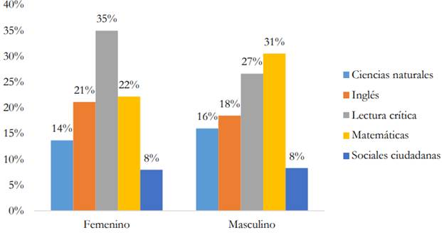 Los estudiantes varones obtuvieron mejores resultados que las mujeres, los hombres se destacan en matemáticas y las mujeres en lectura crítica. Este resultado coincide con el de otros estudios realizados en el país, donde se resaltan aspectos como la cultura, creencias, actitudes y el contexto socioeconómico como elementos favorecedores.