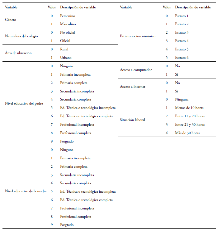 En el análisis econométrico se utilizaron dos modelos de variable dependiente limitada, a saber: logit y probit ordinales. La variable dependiente es politómica de acuerdo con la clasificación establecida por el ICFES discriminada en cuatro categorías excluyentes, así: a) 0 a 35 corresponde a un puntaje insuficiente, b) 36 a 50 como puntaje mínimo, c) 51 a 65 catalogado como satisfactorio y d) 66 a 100 como puntaje avanzado. Los datos obtenidos fueron organizados de menor a mayor puntaje.