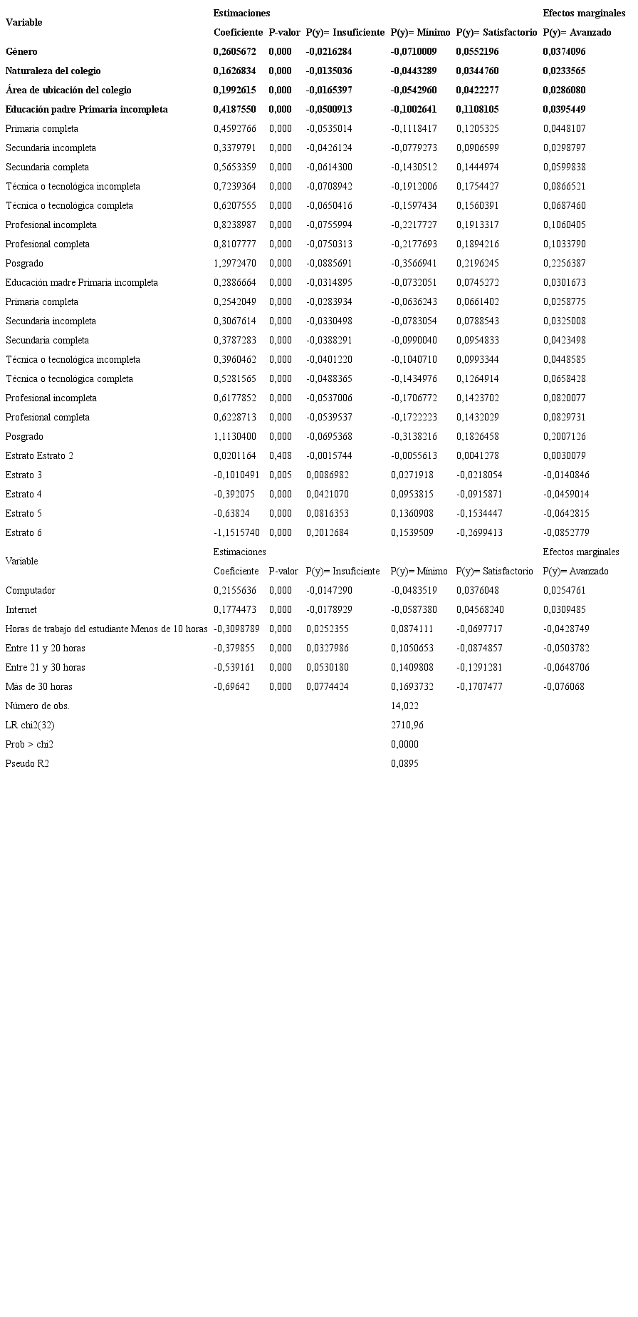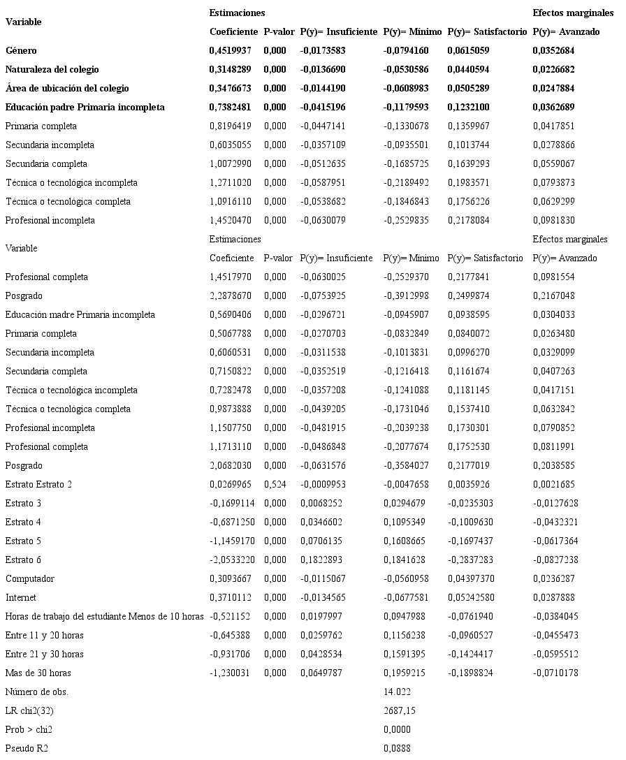 La condición de ser hombre tiene un efecto positivo sobre la probabilidad de obtener un puntaje en las categorías de satisfactorio y avanzado, en armonía con la tesis de Moncayo (2016), según la cual las diferenciales en el rendimiento académico entre hombres y mujeres se deben a factores personales y del entorno social. Por otra parte, la probabilidad de obtener puntajes en las categorías de satisfactorio y avanzado aumenta cuando los estudiantes pertenecen a instituciones oficiales urbanas. Como bien lo señalan Juárez y Rodríguez (2016), en la educación rural hay una menor inversión estatal y una asignación de directivos y docentes con menor preparación académica, sumado a esto, los incentivos para que las personas preparadas se movilicen a las escuelas rurales son mínimos.