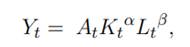At = Cambio tecnológico, o Productividad total de los factores (PTF) Lt = Número de trabajadores α = Elasticidad de la producción agregada con respecto al factor capital β = Elasticidad de la producción agregada con respecto al factor trabajo