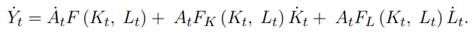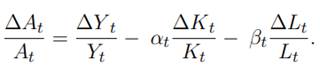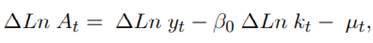 (22)Sin embargo, persiste el problema de poder observar directamente el crecimiento de la tecnología o PTF. Es por ello que se recurre a medirla a través de la metodología suministrada por Solow (1957) discutida en secciones anteriores, teniendo como resultado la ecuación se transforme en: