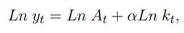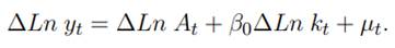 Ln kt = Logaritmo natural del stock de capital por trabajador (medido con un ajuste por capital humano sobre la base de años de escolaridad). Ln At = Productividad total de los factores.