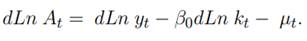 yt = Producto por trabajador (medido con un ajuste por capital humano sobre la base de años de escolaridad) At = Cambio tecnológico o PTF.