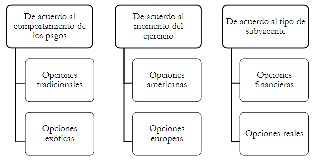 Existen diferentes familias de opciones según el criterio analizado (Figura 1). De acuerdo con el comportamiento de los pagos -y, por lo tanto, el valor del contrato derivado- las opciones pueden ser tradicionales -o vainilla- o bien, exóticas. Según el tiempo para su ejercicio, pueden ser americanas, si el derecho que otorgan se puede ejercer hasta su vencimiento, o europeas, cuando solo puede ejercerse al vencimiento. Finalmente, considerando el activo subyacente, se puede tratar de opciones financieras si tienen mercado de cotización y activos con negociación, o reales cuando el subyacente está vinculado a proyectos de inversión y, por ende, no tienen mercado.