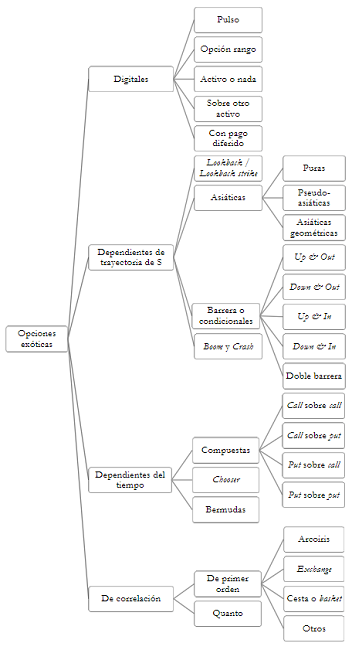 Las opciones exóticas, también conocidas como de segunda y tercera generación, difieren de las clásicas o vainilla, ya sea por la determinación del precio de ejercicio, el precio del activo subyacente, la prima, las condiciones de pago, el número de subyacentes, entre otros (Crespo, 1998). Este tipo de instrumentos se diseña a partir de la modificación de ciertas condiciones del contrato de una opción vainilla y su origen ha sido incentivado por la búsqueda de mejoras en los procesos de administración de riesgos en un contexto de volatilidad creciente en los mercados, los avances tecnológicos y el fuerte desarrollo de la teoría de valoración de opciones (García et al., 2000).