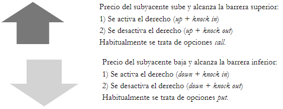De la descripción anterior surgen cuatro combinaciones posibles: up & in, down & in, up & out, down & out, presentadas en la Figura 3. Existe una quinta clase dentro de esta familia de opciones que se presenta cuando el derecho desaparece en caso de que el activo subyacente no permanezca dentro de un rango determinado fijado por una doble barrera.
