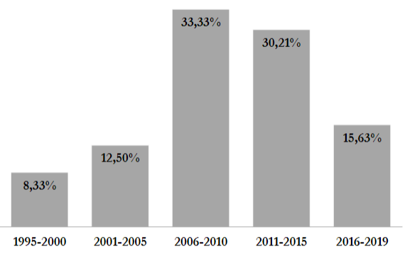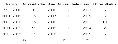 La tendencia temporal de los resultados (Tabla 3, Figura 5) se extiende de 1995 a 2019 con forma de parábola (solo en 1996 no existe ninguna publicación): la primera década muestra un número incipiente de publicaciones; la mayoría de los resultados (63,54 %) se ubica entre 2006 y 2015 y, finalmente, se observa una caída del número de artículos para el lapso 2015-2019. Este decrecimiento puede deberse -además del menor rango temporal considerado- a la demora inherente a la accesibilidad de las publicaciones de los últimos años. El 2013 se destaca por presentar mayor cantidad de trabajos en el tema.