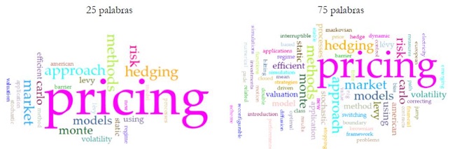 La Figura 65 ilustra el análisis de frecuencia sobre los títulos de las 96 publicaciones relevadas. Entre las palabras más frecuentes se destacan: pricing (39); approach (8); hedging (8); market (8); methods (8); risk (8); Monte Carlo (7); models (7). La elevada frecuencia del término pricing permite inferir que gran parte de los artículos abordan cuestiones de fijación de precios de opciones exóticas. Por su parte, las restantes palabras más frecuentes brindan mayores detalles del trabajo tales como: técnicas empleadas en la valoración (enfoque numérico, método, modelo, simulación Monte Carlo, estático), modelización de la incertidumbre (proceso estocástico, volatilidad, riesgo, proceso de Levy, cambio de régimen, Markov), tipo de opción (barrera, americana, europea) o contribución y resultados (nuevo, eficiente, aplicaciones).