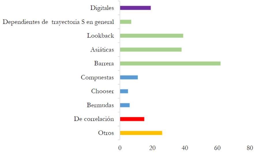 Dentro de la tipología exótica, el ranking de las opciones con mayor presencia se conforma como muestra la Figura 7, donde las familias de opciones se visualizan agrupadas por colores. Acentuadamente, las opciones barrera son las que se abordan de manera más frecuente dentro de la literatura académica. Las familias de opciones exóticas con mayor presencia son las dependientes de la trayectoria del subyacente (barrera, lookback y asiáticas) seguidas por las dependientes del tiempo (compuestas, chooser y bermudas); las digitales o binarias (puras, activo o nada y dinero o nada); y, en último lugar, las de correlación (arcoíris, basket, entre otras). No se releva ninguna publicación que estudie las opciones boom y crash en particular.