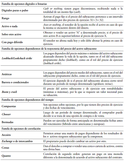Dentro del diverso conjunto de derivados exóticos1, se puede mencionar, a modo de ejemplo, opciones compuestas, digitales, chooser, barrera, lookback, asiáticas, arcoíris, entre otras. La mayoría de estos instrumentos exóticos se negocian en el mercado over-the-counter. La Figura 2 exhibe los principales tipos de opciones exóticas2 agrupados por familias. La descripción de tales opciones se presenta en las secciones siguientes y se resume esquemáticamente en la Tabla 1.